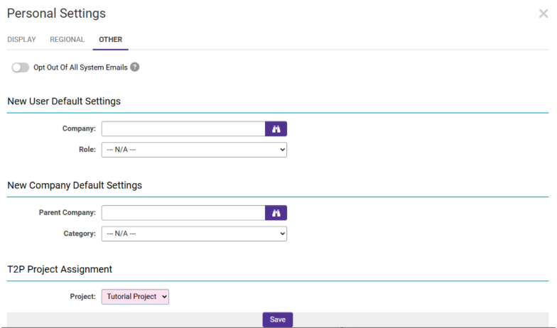 - Navigate to User Menu > Personal Settings > Other tab > Under T2P Project Assignment, select the desired project to track changes against.