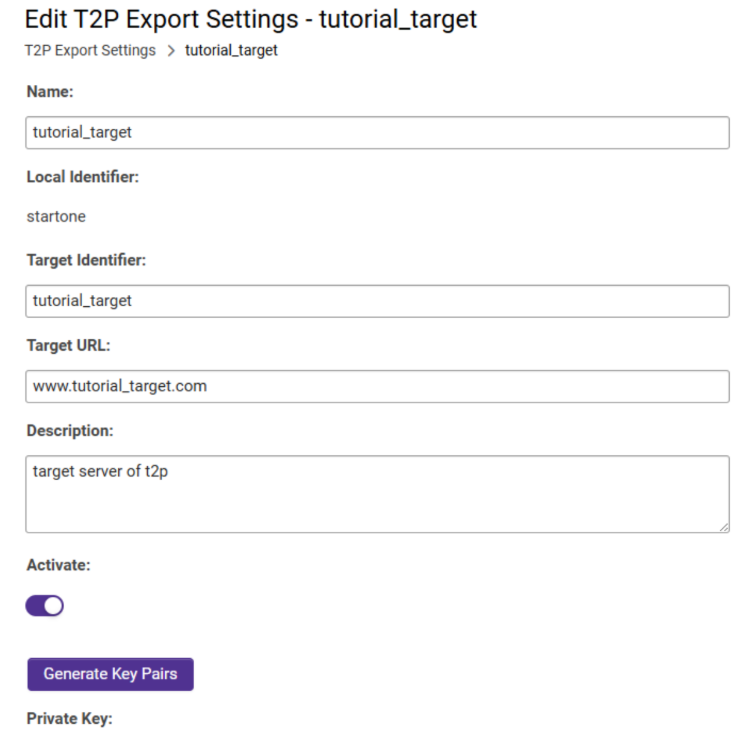 The “Activate” button enables the settings after all fields are completed. The “Generate Key Pairs” button creates two keys: a private key and a public key. The public key must be copied and pasted into the Import Settings on the target server or instance.