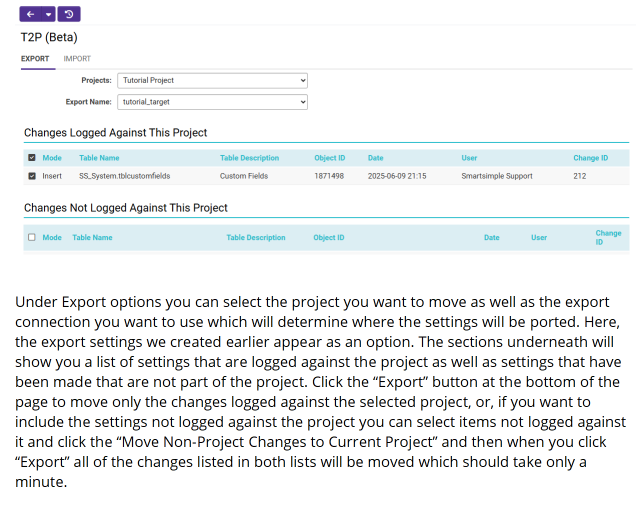 Under Export options, select the project you wish to transfer and the export connection to determine the destination for the configuration changes. The export settings configured earlier will appear as options. The sections below display a list of changes logged against the project and those not associated with the project. Click the “Export” button at the bottom to transfer only the changes logged against the selected project. Alternatively, to include changes not logged against the project, select those items and click “Move Non-Project Changes to Current Project.” Then, when you click “Export,” all listed changes will be transferred, typically within a minute.