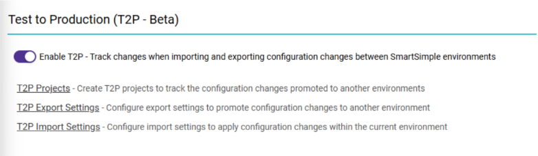 The Test to Production (T2P) feature facilitates the tracking and promotion of configuration changes on a project-specific basis. This functionality enables teams to independently implement changes within a project and subsequently promote those changes to another SmartSimple environment. For instance, modifications can be transitioned from a dedicated development environment to a testing environment and ultimately to a production environment. This innovative feature significantly expedites the promotion of changes between instances, completing the process in a fraction of the time compared to the desktop tool.