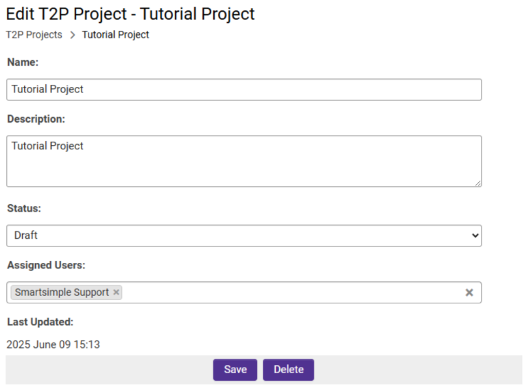 A project must be in the “In Progress” status to be editable by users. Projects marked as “Closed” or “Draft” are not available for editing. The “Assigned Users” field determines which users have permission to modify the project; if no users are assigned, no one can work on the project.
