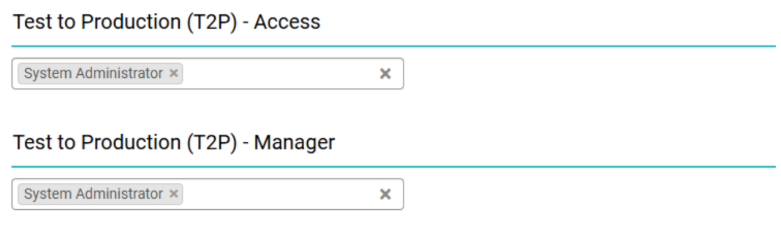 Only users with roles authorized to use the T2P tool are eligible for assignment. To enable T2P access for a role, navigate to “Global Settings” > “Security” tab > “System Feature Permissions” > “Features” tab > scroll down to the fields “Test to Production (T2P) - Access” and “Test to Production (T2P) - Manager.”