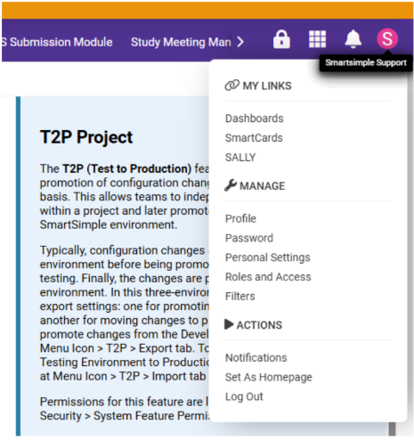“Test to Production (T2P) – Manager”: grants users the ability to import and export configuration changes via the menu icon.