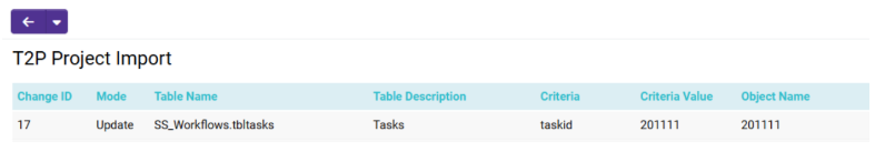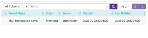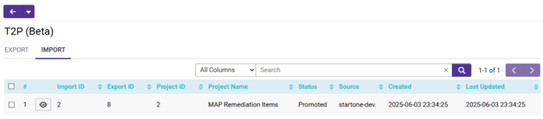 Returning to Grid Menu > “Tools” > “T2P” will show the importing project’s status as “Promoting” while changes are applied. Refresh the page after a few minutes; the status should update to “Promoted.”