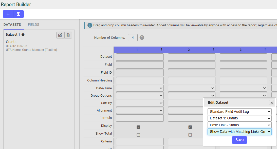 - Within the Report Builder, add your primary UTA Level-1 dataset, then add the associated Standard Field Audit Log as a secondary dataset from the same UTA.